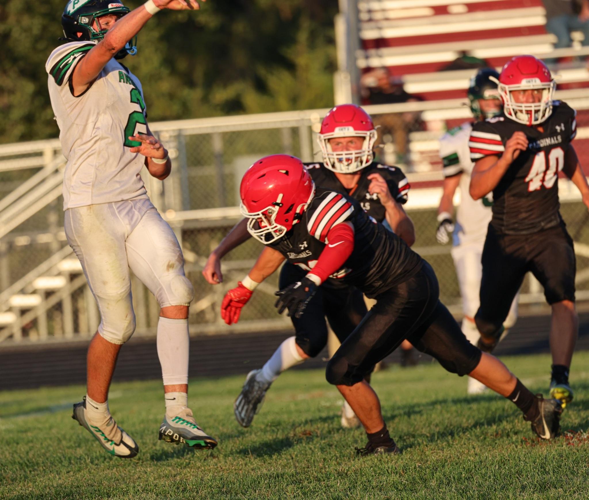 Shutting out the Cards in the second half the St. Cloud Cathedral Crusaders held off visiting Redwood Valley 21-14 in the regular season finale for both schools Wednesday, Oct. 15 at St. John’s University.